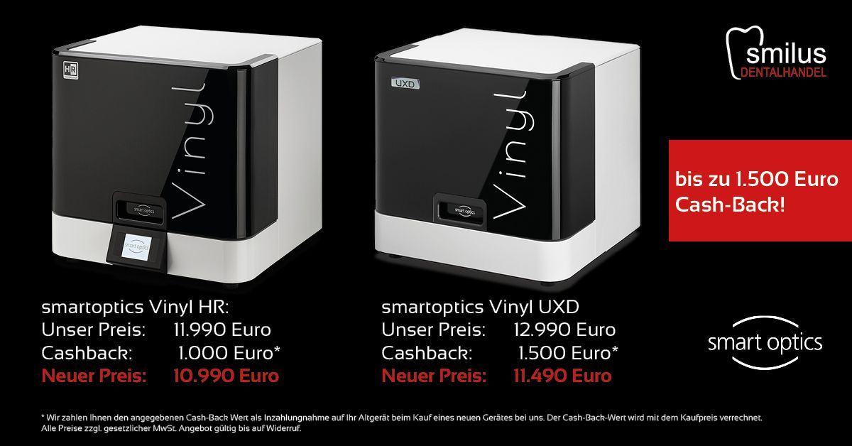 Jetzt 1.500 Euro Cash-Back bekommen indem Sie Ihr Altgerät bei uns in Zahlung geben. Der Cash-Back Wert wird beim Kauf eines neuen smart optics Vinyl High Resolution (1.000 Euro Cash-Back) oder eines neuen smart optics Vinyl UXD (1.500 Euro Cash-Back) mit dem Kaufpreis verrechnet! Angebot gültig bis auf Widerruf!